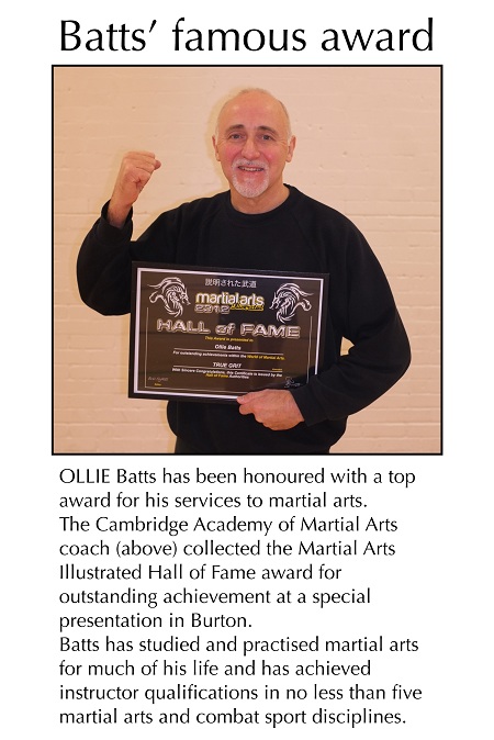 Senior Instructor Ollie Batts has been honoured with a top awarded for his services to martial arts. Accompanied by several senior students and members of his family, Ollie was presented with the award at the Martial Arts Illustrated Hall of Fame presentation evening in Burton-on-Trent in November.