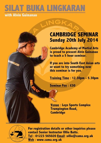 Cambridge Academy of Martial Arts is proud to present Alvin Guinanao to teach a 5 hour seminar, in Silat Buka Lingkaran, on 20th July.
